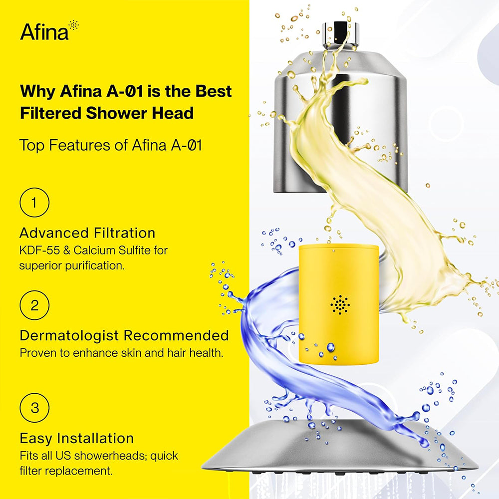 The Afina Replacement filter uses powerful filtration to capture harmful substances in your water. The number 1 recommended shower head by dermatologist filters out 98% of the chlorine, heavy metals and chemicals that are in your shower water. It only takes 5 minutes to install and all the tools needed are included as well! Over 90% of our customers notice a difference with smoother hair and softer skin in less than 6 weeks of using the Afina filtered shower head.